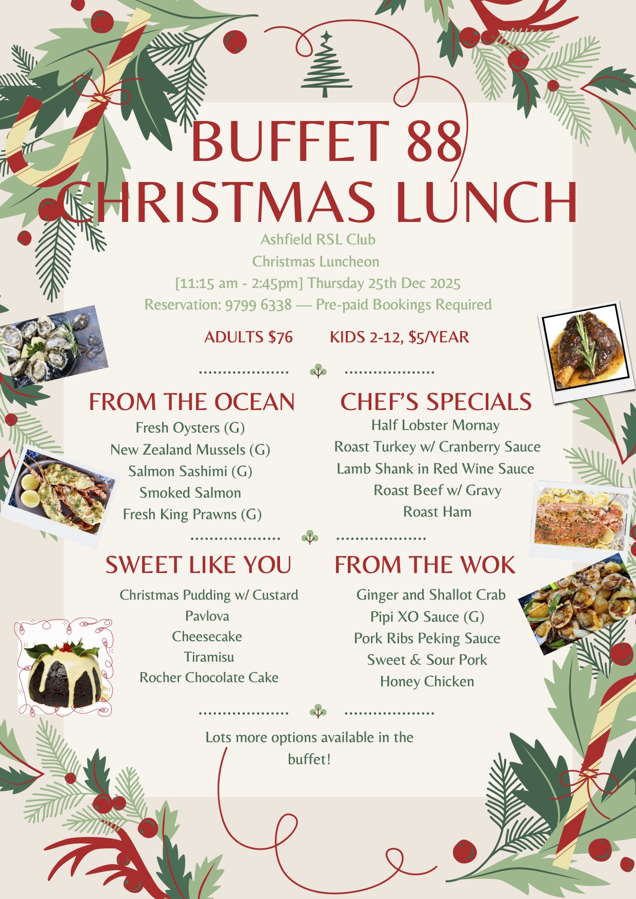 Half Lobster Mornay, Roast Turkey w/ Cranberry Sauce, Lamb Shank in Red Wine Sauce, Roast Beef w/ Gravy, Roast Ham